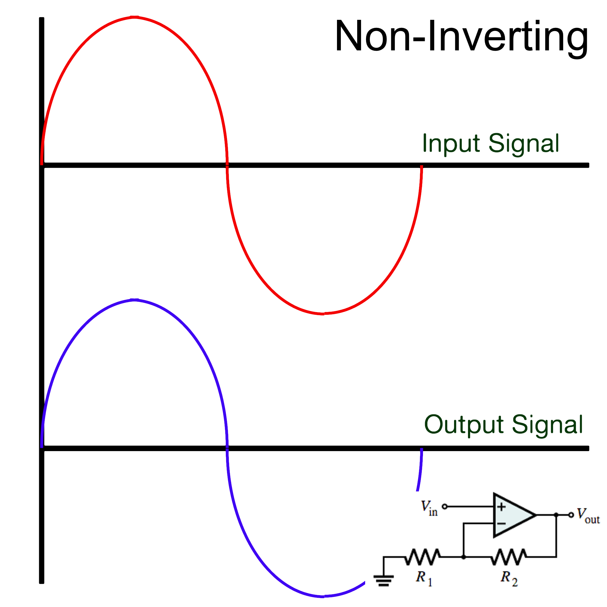 Two basic op amp configurations are known as “non-inverting amplifier” and “inverting amplifier”. The output of the non-inverting amplifier will remain in phase with the input signal, while the output of the inverting amplifier is 180-degrees out of phase. Both configurations take advantage of a design technique known as “negative feedback” which take the output signal and through a resistor network feeds it back into the inverting input. This is what allows amplification to occur. The non-inverting configuration feeds the input signal into the non-inverting (+) input of the op amp.  Conversely, with an inverting configuration, the signal is fed in through the inverting (-) terminal.