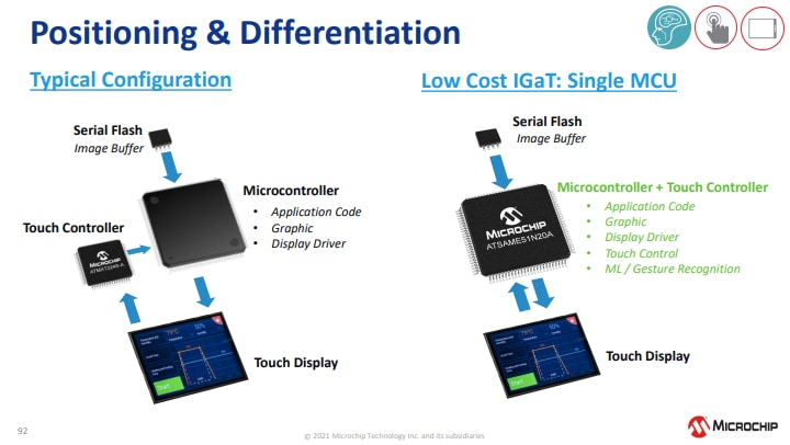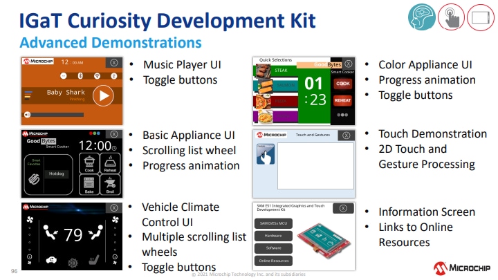 Microchip Technology SAM E51 Integrated Graphics and Touch (IGaT) Curiosity Evaluation Kit is a hardware platform for evaluating the SAME51J20A microcontroller. The kit integrates a complete touch screen, TFT graphics, and touch surface into a single-chip solution. It's supported by the MPLAB® X Integrated Development Environment (IDE). The kit provides easy access to the features of the SAME51J20A to integrate the device into a custom design. The Integrated Graphics and Touch Curiosity Evaluation Kit includes an onboard debugger. No external tools are necessary to program the SAME51J20A device.Features